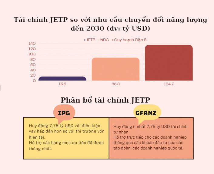 Nguồn tài chính của JETP chỉ là một phần nhỏ trong tổng nhu cầu tài chính cho CĐNL giai đoạn đến năm 2030, bởi vậy, các nguồn lực phải được sắp xếp ưu tiên một cách có chiến lược. Kế hoạch huy động thực hiện Tuyên bố JETP được xây dựng trên cơ sở nội dung Đóng góp do quốc gia tự quyết định (NDC), Quy hoạch phát triển điện lực quốc gia và Quy hoạch tổng thể năng lượng quốc gia thời kỳ 2021 – 2030, tầm nhìn đến năm 2050, Đề án triển khai Tuyên bố JETP và đề xuất của các đối tác trong nước và quốc tế.